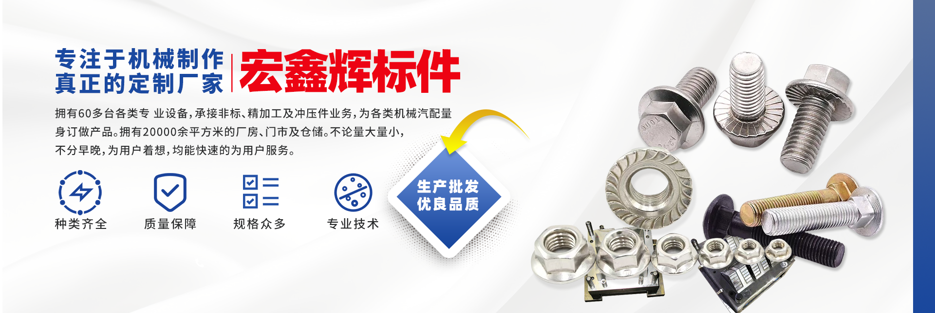四川宏鑫輝標(biāo)準(zhǔn)件制造有限公司下設(shè):南充市宏輝機(jī)械制造有限公司,南充市聚宏機(jī)電設(shè)備有限公司,公司始建于1994年。為了拓展市場(chǎng),降低成本,本公司于2007年、2020年分別在南充、 成都、重慶創(chuàng)建了生產(chǎn)基地。擁有60多臺(tái)各類(lèi)專(zhuān) 業(yè)設(shè)備,承接非標(biāo)、精加工及沖壓件業(yè)務(wù),為各 類(lèi)機(jī)械汽配量身訂做產(chǎn)品。擁有20000余平方米的廠房、門(mén)市及倉(cāng)儲(chǔ)。公司以誠(chéng)信為本,竭誠(chéng)為廣大客戶(hù)提供服務(wù)。不論量大量小,不分早晚,為用戶(hù)著想,均能快速的為用戶(hù)服務(wù)。 公司所生產(chǎn)及代理的產(chǎn)品為業(yè)界人士公認(rèn)的國(guó)內(nèi)、國(guó)際優(yōu)等品牌。在產(chǎn)品性能與質(zhì)量